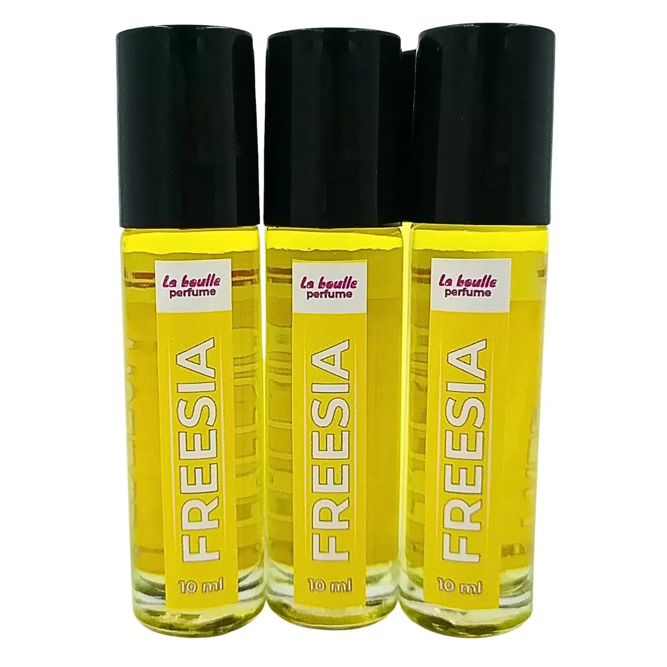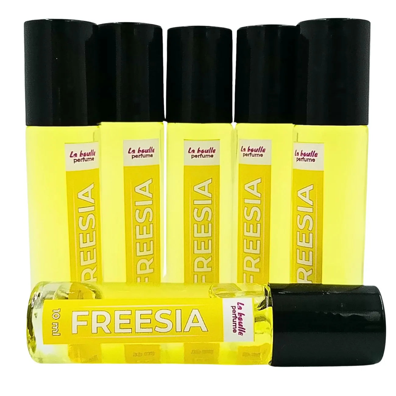 Freesia roll-on perfume bottles La Boulle with black caps on a white background