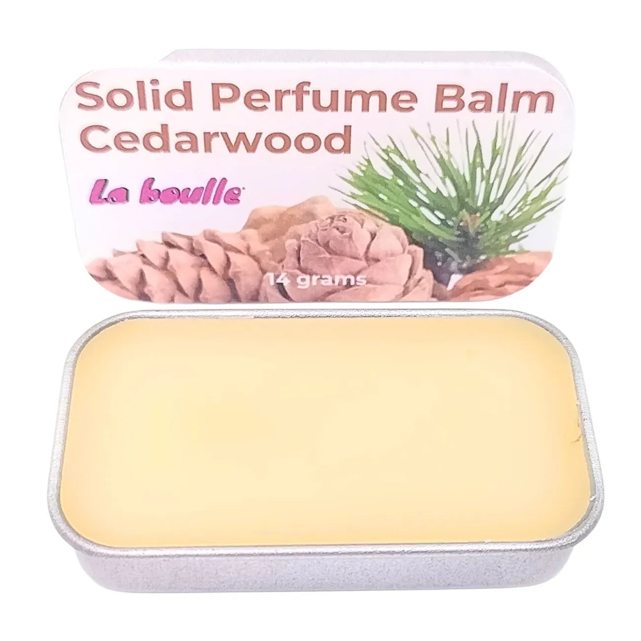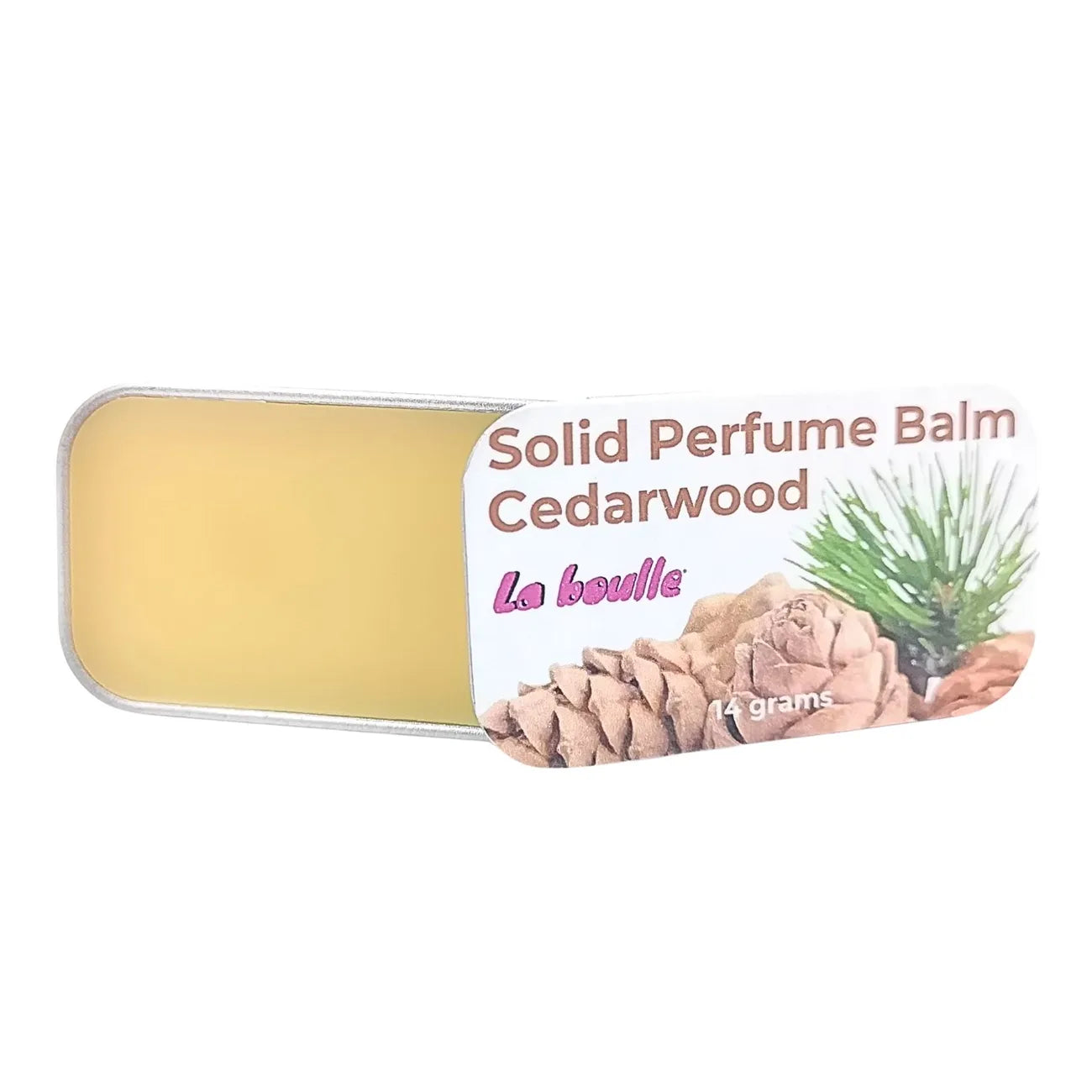 Cedarwood solid natural perfume balm, La Boulle, on a white background