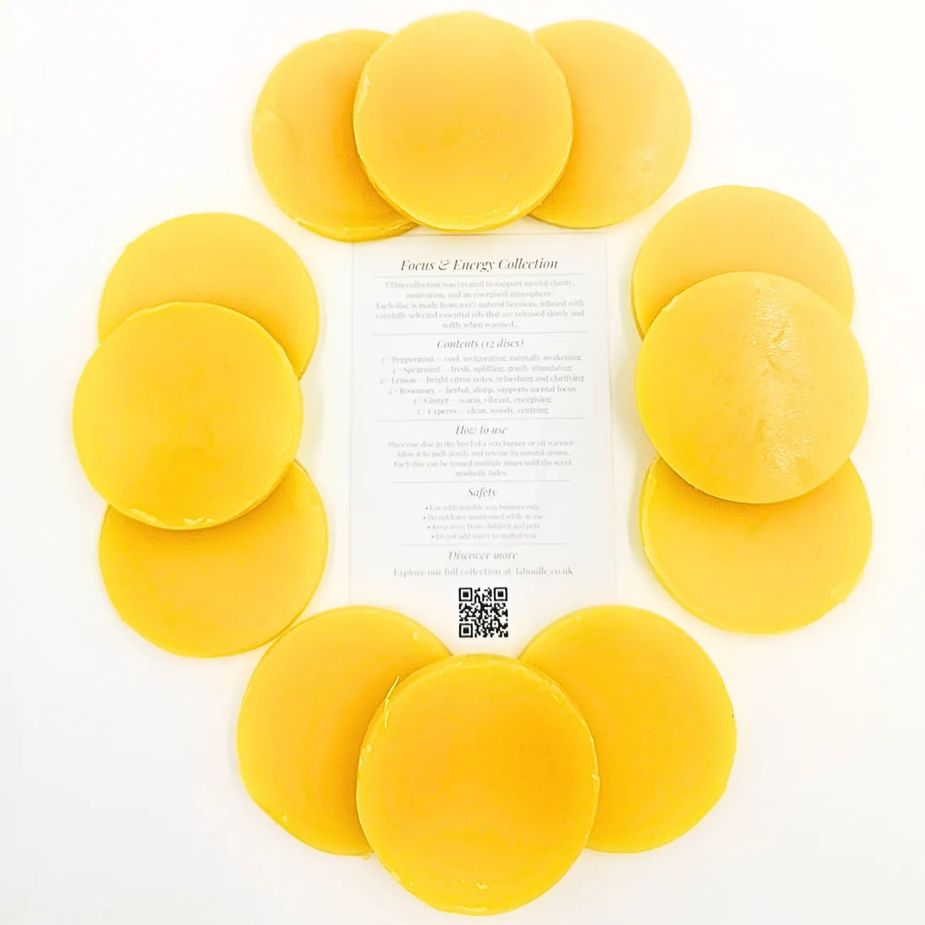 Each set contains twelve handcrafted beeswax wax melts made in small batches in the UK. When gently warmed in a wax burner, the essential oils release a vibrant fragrance that creates a focused and refreshing environment.
