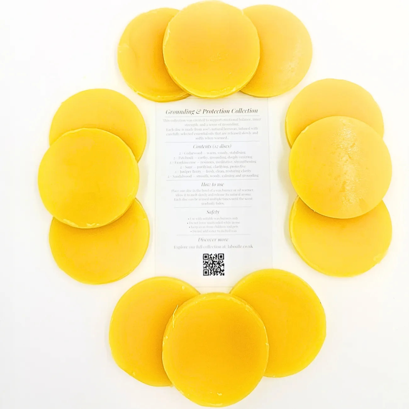 The Grounding & Protection Wax Melt Gift Set combines natural beeswax with a deep and calming aromatherapy blend of Cedarwood, Patchouli, Frankincense, Sage, Juniper Berry and Sandalwood.