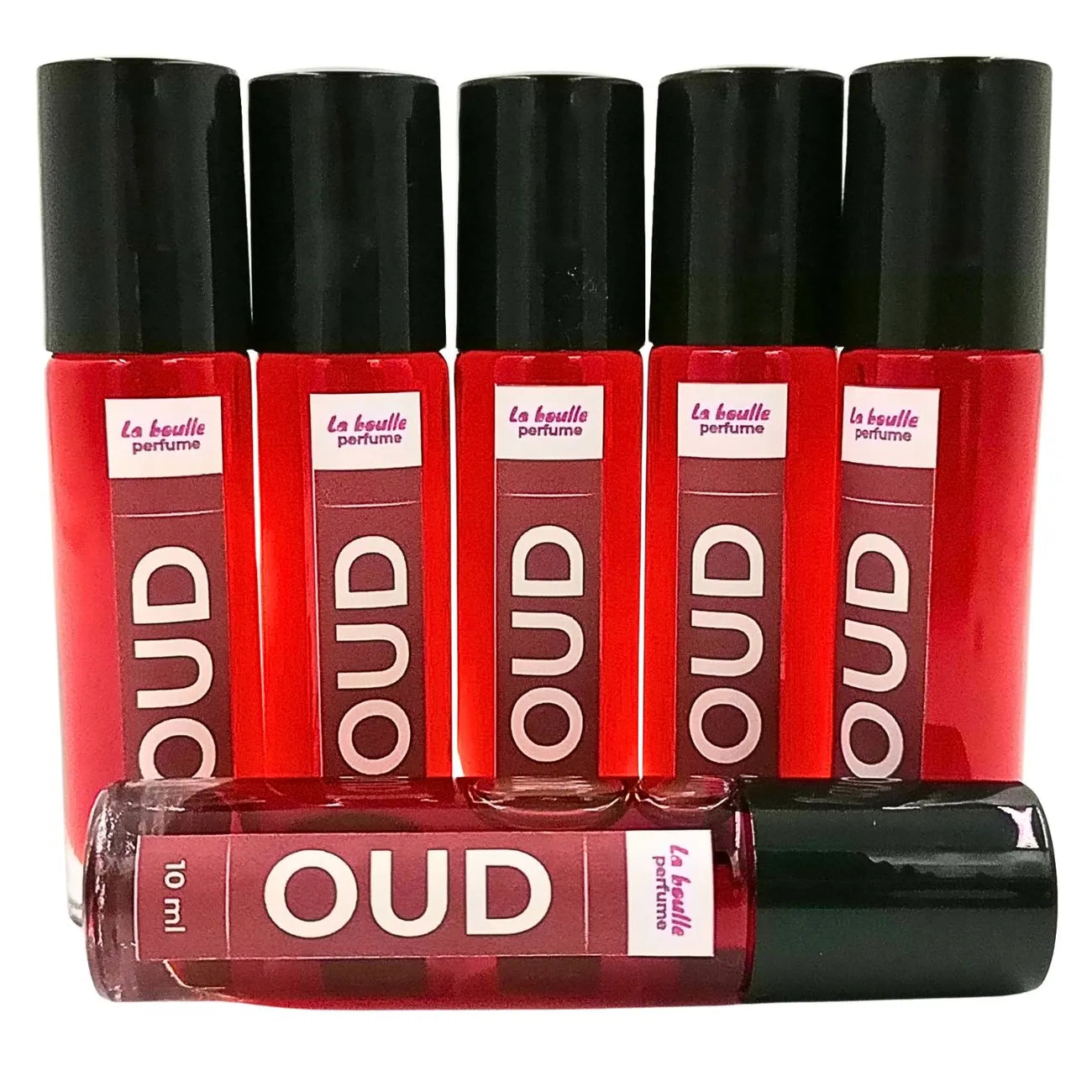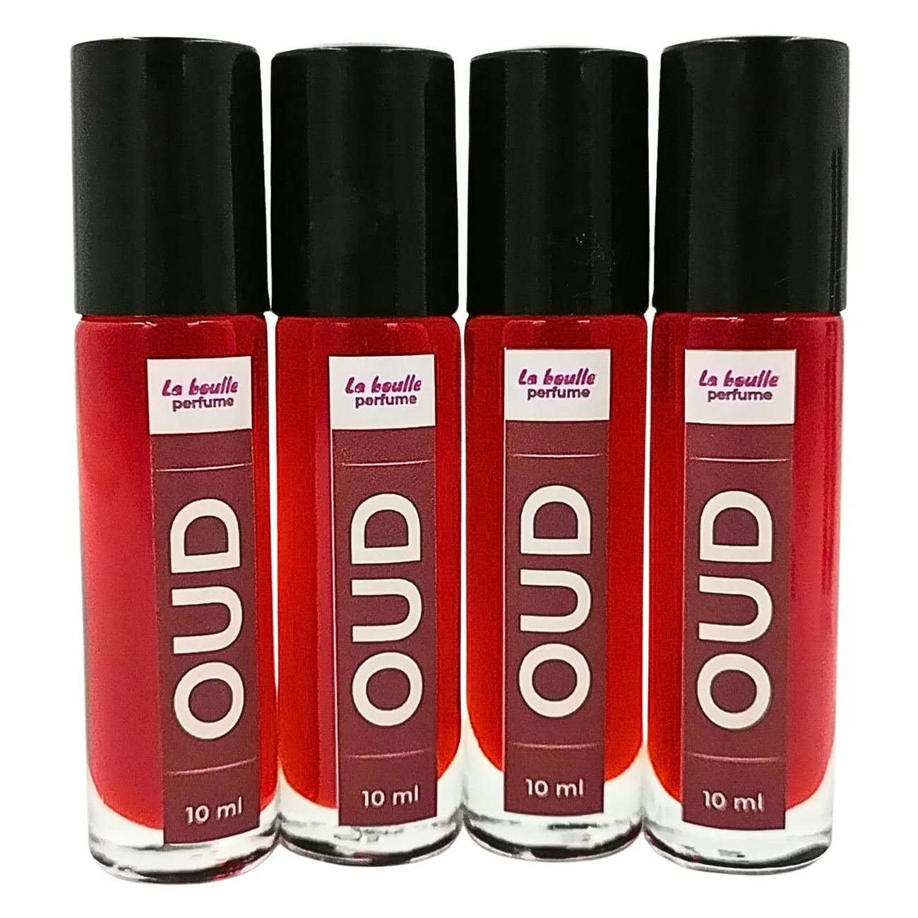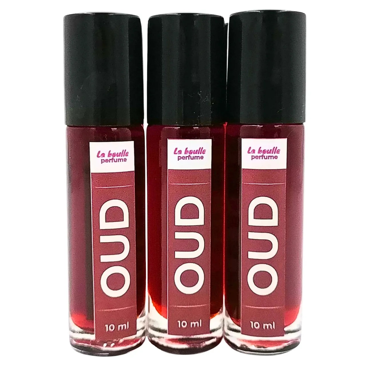 Oud roll-on perfume bottles La Boulle with black caps on a white background
