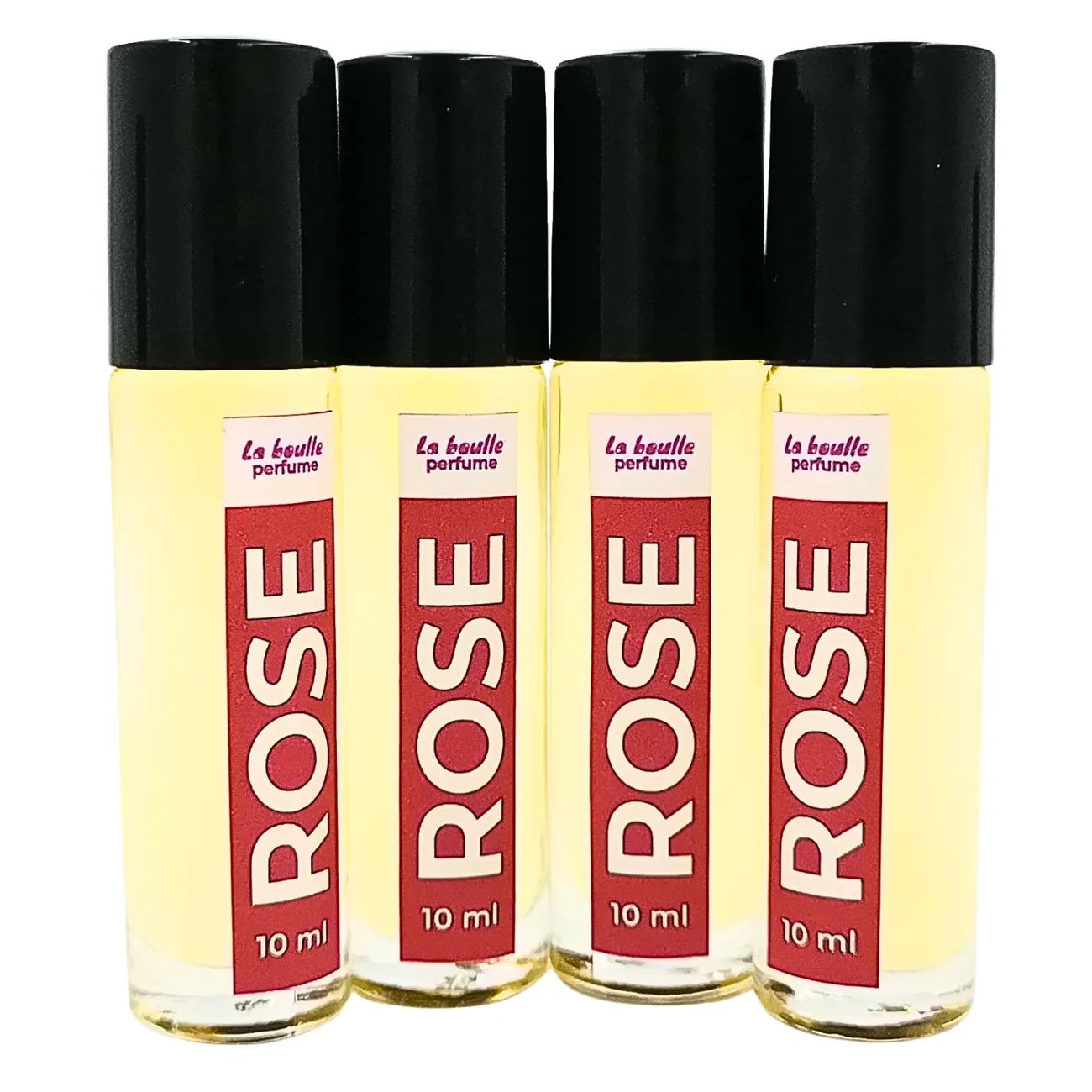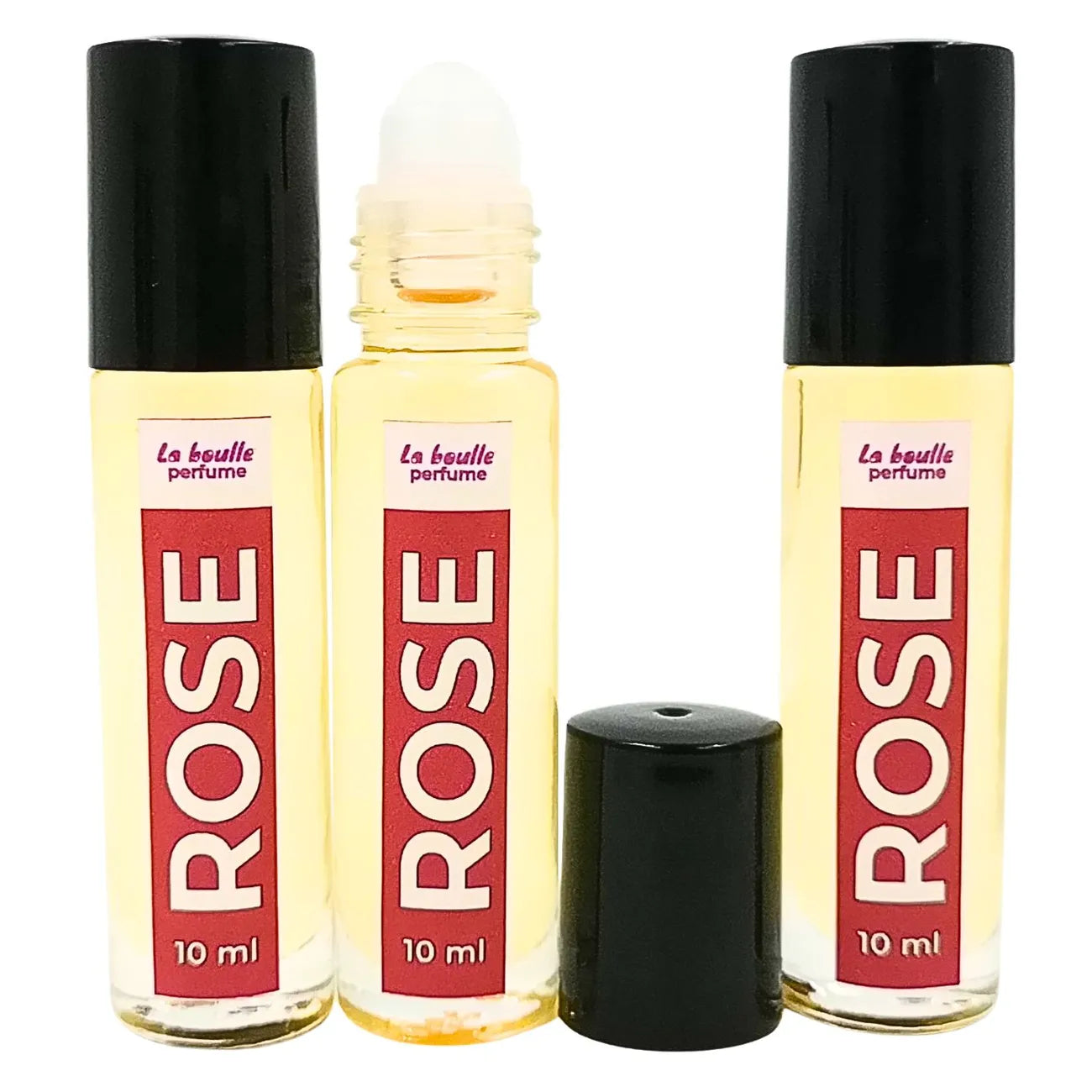 Rose roll-on perfume bottles La Boulle with black caps on a white background