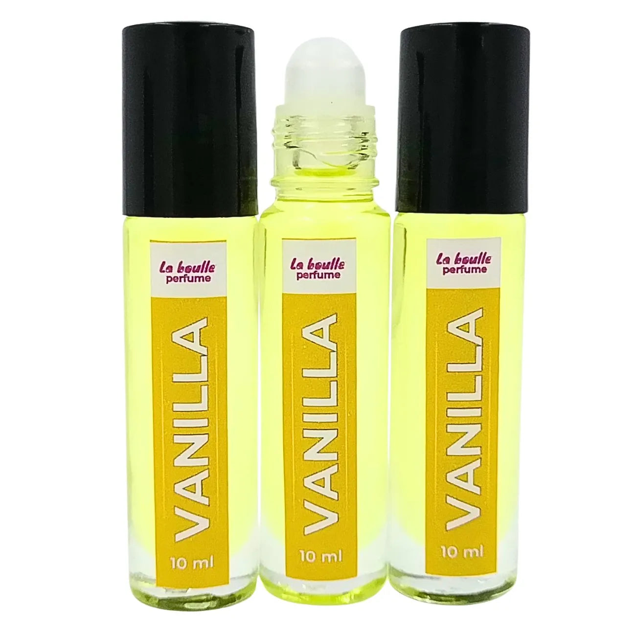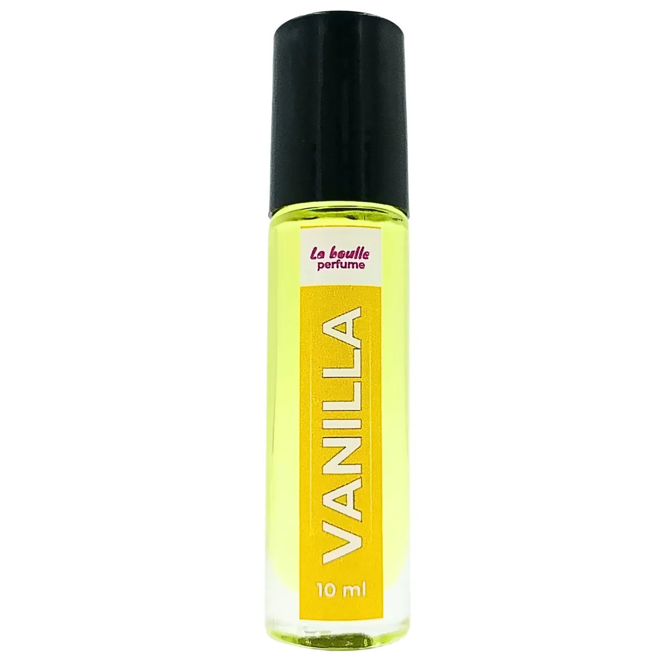 Vanilla roll-on perfume bottles La Boulle with black caps on a white background
